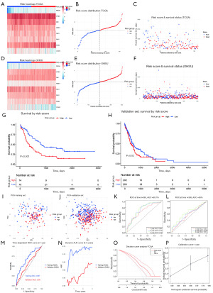 To further assess the clinical utility of the 8-gene risk scoring model, this study performed multidimensional validation analyses in both the training cohort (TCGA-LAML) and an independent validation cohort (OHSU). First, patients were stratified into high- and low-risk groups based on the median risk score. A heatmap of gene expression revealed that the high-risk group exhibited generally elevated expression levels of most model genes (Figure 11A). The corresponding risk score distribution plot showed a marked increase in risk scores among high-risk patients (Figure 11B), and the survival status distribution plot indicated that patients in the high-risk group tended to have shorter survival durations and higher mortality (Figure 11C). In the validation cohort, the same risk stratification showed a consistent direction of association, although the separation between risk groups was less pronounced compared with the training cohort (Figure 11D-11F). Kaplan-Meier survival analysis further confirmed the prognostic power of the risk score: in both the training and validation cohorts, patients in the high-risk group had significantly shorter OS compared to those in the low-risk group (training set: P<0.001; validation set: P=0.02; Figure 11G,11H), with a reduced effect size observed in the validation cohort. PCA revealed clear transcriptional separation between the high- and low-risk groups (Figure 11I,11J). To evaluate predictive performance, time-dependent ROC curve analysis was conducted. In the training set, the AUCs at 1, 2, and 3 years were 0.697, 0.742, and 0.743, respectively (Figure 11K). In contrast, the validation cohort showed lower AUC values (0.560, 0.578, and 0.640 at 1, 2, and 3 years, respectively; Figure 11L), indicating a more modest predictive performance while preserving the same risk direction. ROC curves at the 1-year time point allow for a clear comparison of AUC values between the training and validation sets (Figure 11M). The dynamic AUC curves further illustrate the temporal performance of the model in both datasets (Figure 11N). DCA indicated that across a wide range of threshold probabilities, the model provided greater net clinical benefit compared to either the “treat all” or “treat none” strategies (Figure 11O). Finally, calibration curves showed good agreement between predicted and observed survival probabilities, particularly for 1-year survival prediction (Figure 11P).