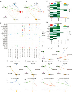 To explore the intercellular communication mechanisms among AML subtypes, we constructed a CellChat model based on the five annotated functional categories: HSC-like, HSC/MPP-like, CMP-like, GMP-like, and differentiated AML. The global interaction network revealed extensive communication among these cell types (Figure 7A), with differentiated AML and CMP-like AML exhibiting the highest number of interactions. Analysis of interaction strength further indicated variable pathway activity levels despite widespread signaling across cell types (Figure 7B). Then the incoming (receptor) and outgoing (ligand) signal flux for each subtype was quantified and visualized using bar plots and heatmaps (Figure 7C,7D). HSC-like and HSC/MPP-like AML subtypes primarily acted as signal senders, while differentiated AML cells were more inclined toward signal reception, suggesting a reliance on extrinsic cues for microenvironmental modulation. Bubble plots illustrated the source-target relationships of all major signaling pathways (Figure 7E), highlighting active transmission of major histocompatibility complex class II (MHC-II), CD99, MIF, LGALS9 (Galectin-9), and PECAM1 signals across AML differentiation stages. While Figure 7C,7D summarize pathway-level aggregated incoming and outgoing signaling roles across AML subtypes, Figure 7E depicts significant ligand-receptor interactions at the communication pair level; therefore, weaker or non-significant interactions may be less apparent in the bubble plot representation. Immune-related pathways such as IL-16, MIF-CD74, and APP-CD74 were also predominantly active between terminally differentiated and GMP-like AML cells, implying a potential immunosuppressive regulatory axis in AML. Finally, cluster-specific outgoing and incoming communication maps (Figure 7F-7O) were generated, which further delineated the distinct signaling roles of AML subtypes within the communication network. For instance, HSC-like AML subtypes mainly functioned as unidirectional signal senders, whereas CMP-like and differentiated AML subtypes served as primary receivers, integrating extracellular signals into their cellular states.