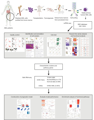 This study analyzed single-cell transcriptomic data from AML patients to characterize the differentiation landscape and intratumoral heterogeneity, identify key genes involved in dedifferentiation and immune regulation, and focus on the potential role of UNC13D in modulating immune escape and dedifferentiated states. By integrating bulk RNA sequencing data from The Cancer Genome Atlas (TCGA) and an external validation cohort, we further constructed and validated a prognostic risk model incorporating both immune and dedifferentiation signatures, and explored its biological underpinnings through cell-cell communication analysis and pathway enrichment (Figure 1). These findings may provide novel theoretical insights and therapeutic targets for the pathogenesis, early diagnosis, and individualized treatment of AML. We present this article in accordance with the TRIPOD reporting checklist (available at https://tcr.amegroups.com/article/view/10.21037/tcr-2025-aw-2307/rc).