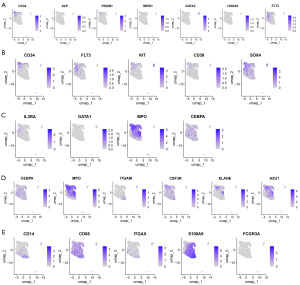 To preliminarily explore the developmental trajectories of different cell clusters, a panel of marker genes representing key stages of hematopoietic differentiation was compiled: HSCs: CD34, AVP, PROM1, MEIS1; MPPs: KIT, CD38, SOX4; common myeloid progenitors (CMPs)/GMPs: CEBPA, MPO, ITGAM; terminally differentiated cells (Diffs): CD14, CD68, S100A9. Using FeaturePlot on uniform manifold approximation and projection (UMAP) coordinates (Figure 4), the expression of these markers across clusters was visualized. Notably, CD34 and PROM1 were enriched in specific clusters, indicating retention of stem-like properties. Genes such as ELANE, AZU1, and CEBPA showed variable expression across clusters, suggesting differences in developmental hierarchy or immune function. High expression of CD14 and S100A9 in certain populations indicated a trend toward terminal differentiation. These distribution characteristics indicate that there are multiple cell populations with different developmental stages and lineage tendencies in the AML samples, providing important reference basis for subsequent annotation.