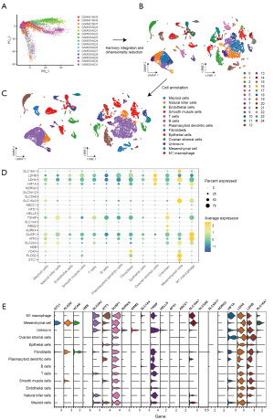 The Gene Expression Omnibus (https://www.ncbi.nlm.nih.gov/geo/) is a commonly used database for bioinformatics analysis. Within it, the GSE184880 dataset includes five normal ovarian tissue samples and even HGSOC tissue samples, while the GSE158937 dataset contains three HGSOC tissue samples. We used GSE184880 and GSE158937 to characterize the TME of OV at the scRNA level according to the standard process of the Seurat R package. All samples were screened as follows: each feature needed to be expressed in at least three cells, every cell needed to express at least 200 features, the mitochondrial genes expressed by one cell were required to be less than 5%, and the total expression features of a cell were between 200 and 5,000. Subsequently, each sample was normalized (NormalizeData function), 5,000 characteristic genes per cell were identified (FindVariableFeatures function), scaling was completed (ScaleData function), principal component analysis (PCA) was conducted for dimensionality reduction (RunPCA), and the batch effect was controlled via the harmony R package. Similar clusters were identified via the FindNeighbors and FindClusters functions, and the data was reduced in dimensionality and visualized via both Uniform Manifold Approximation and Projection (UMAP) and t-distributed stochastic neighbor embedding (t-SNE). The FindAllMarkers function in the Seurat R package was then used to identify the marker genes of the cell clusters, with all cells being annotated via the CellMarker 2.0 website (http://bio-bigdata.hrbmu.edu.cn/CellMarker/index.html).