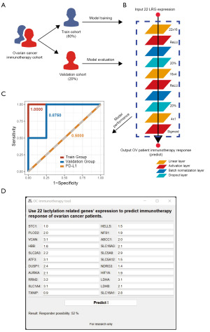 In this study, we screened lactylation-related genes (LRGs) reported in the literature and discovered that LRGs can be used to further stratify patients with OV and predict their response to immunotherapy. In order to facilitate the medical use of LRGs, a desktop tool for predicting immune efficacy was produced and then uploaded. Finally, it was found that the core genes of LRGs were LDHA and LDHB and that they have a significant influence on the prognosis of patients with OV. We present this article in accordance with the TRIPOD reporting checklist (available at https://tcr.amegroups.com/article/view/10.21037/tcr-2025-1802/rc).