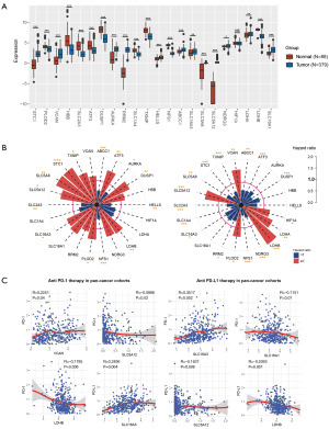 Immunotherapy cohorts from the KMplot website, including 520 cases receiving anti-PD-1 treatment and 486 cases receiving anti-PD-L1 treatment (both including neoadjuvant and adjuvant therapy), were examined in terms of overall survival (OS). The majority of LRGs were found to be correlated with patients’ prognosis after administration of anti-PD-1/PD-L1 treatment in the pancancer data. In brief, in the pancancer anti-PD-1 therapy cohorts, TXNIP, STC1, SLC5A8, SLC5A12, SLC16A3, PLOD2, NFS1, NDRG3, LDHB, DUSP1, and ATF3 were associated with a worse prognosis, whereas SLC2A3, HELLS, AURKA, and ABCC1 were associated with a better prognosis (Figure 2B). Meanwhile, in the pancancer anti-PD-L1 therapy cohorts, VCAN, SLC5A12, PLOD2, LDHB, LDHA, and HIF1A were associated with a worse prognosis, whereas TXNIP, STC1, SLC5A8, SLC2A3, SLC1A4, SLC16A3, RRM2, NFS1, NDRG3, HELLS, DUSP1, AURKA, ATF3, and ABCC1 were associated with a better prognosis (Figure 2B).