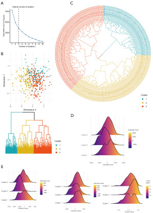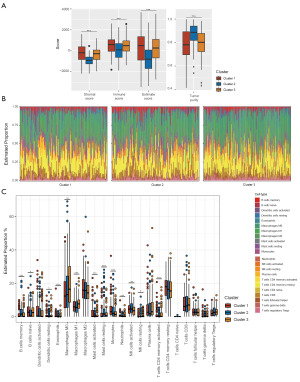 Considering that 22 LRGs were associated with PD-1/PD-L1 expression, we speculated that LRGs may play important roles in the TME and sought to further subgroup patients with OV using the 22 LRGs and PD-1 and PD-L1 expression. Cluster analysis was therefore conducted then. With the obvious inflection point of 3, the optimal number of clusters was determined to be 3 (Figure 3A). k-means and hierarchical clustering analyses showed that patients with OV could be grouped and distinguished clearly via the 22 LRGs and PD-1/PD-L1 expression (Figure 3B). Figure 3C depicts the TCGA sample number belonging to the three OV clusters in the form of a ring diagram. ESTIMATE is a commonly used algorithm for assessing the TME, providing stromal (reflecting the abundance of stroma in tumor tissue), immune (reflecting the infiltration of immune cells in tumor tissue), and estimate scores (reflecting tumor purity) by capturing the related genes’ presence and expression (19). ESTIMATE was employed to compare the immune scores of three clusters, which are shown in Figure 3D,3E. Furthermore, the Kruskal-Wallis test indicated that the three groups had different stromal (P<0.001)), immune (P<0.001), estimate (P<0.001), and tumor purity (P<0.001) scores (Figure 4A). Cluster 1 had the highest stromal cell constituent, the highest immune cell proportion, and the lowest tumor purity. Cluster 2 had the lowest stromal cell constituent ingredient, the lowest immune cell element, and the highest tumor purity. Cluster 3 had an intermediate stromal cell, immune cell, and OV tumor cell constituent (Figure 4A).