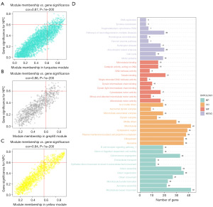 Scatter plots depicting gene-module eigengene and gene-NPC trait correlations were generated for each co-expression module (Figure 4A-4C). Based on the criteria of Gene Significance >0.6 and Module Membership >0.6, a total of 401 key genes were identified across three modules: 222 from the yellow module, 40 from the grey 60 module, and 139 from the turquoise module. Functional enrichment analyses were then performed on these 401 genes, including GO and KEGG pathway analysis. The top 10 entries of each category were visualized as bar plot (Figure 4D). The key module genes were significantly enriched in pathways and biological processes including “Motor proteins”, “Cell cycle”, “microtubule-based movement”, and “chromosome segregation”.
