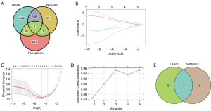 A list of FRGs (Table S1) was retrieved from the FerrDb database. Genes overlapping among DEGs, WGCNA-derived module genes, and FRGs were identified. Finally, two machine learning approaches were applied to identify key genes: (I) least absolute shrinkage and selection operator (LASSO) regression analysis conducted via the “glmnet” package (v 4.1-7); and (II) support vector machine-recursive feature elimination (SVM-RFE) analysis carried out using the “caret” (v 6.0-94) and “e1071” (v 1.7-13) packages.