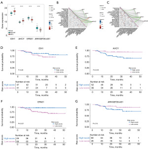 The optimal cutoff values for each gene were determined (Table 1), and samples were accordingly categorized into high- and low-risk groups. Kaplan-Meier analysis (univariate analysis) revealed that only AHCY and EPAS1 were associated with the survival of patients with NPC (Figure 6D-6G). Specifically, high expression of AHCY was linked to a lower survival rate, whereas high expression of EPAS1 was in association with a higher survival rate. Therefore, AHCY and EPAS1 represents a predictor of poor prognosis in NPC.