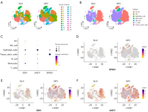 Unsupervised clustering of single cells in the GSE150825 dataset revealed 24 distinct cell clusters. T-distributed stochastic neighbor embedding (t-SNE) distribution maps for both the NPC and NLH groups were constructed (Figure 7A). Based on the annotation of cell clusters, seven distinct cell types were identified: DCs, monocytes, B cells, epithelial cells, NK cells, T cells, and tissue stem cells, and their distributions were visualized (Figure 7B). Notably, ARHGEF26.AS1 was not detected in the single-cell dataset. The gene expression bubble plot revealed that IDH1, AHCY, and EPAS1 were mainly expressed in epithelial cells (Figure 7C). Expression heatmaps were then constructed for visualization of the distribution of these three genes in the NPC and NLH groups separately (Figure 7D-7F). All three genes exhibited more extensive and increased expression in NPC relative to NLH group.