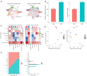 In NPC samples, tissue stem cells and DCs exhibited enhanced intercellular communication with other cell populations (Figure 8A). The number and strength of intercellular communication in both NLH and NPC samples was illustrated in a bar plot (Figure 8B), while the overall patterns of cell-cell interaction were visualized through heatmaps (Figure 8C). Compared to NLH cells, NPC cells exhibited a marked increase in communication strength. The distribution of incoming/outgoing signaling strength across cell types revealed significantly reduced incoming interactions in NPC tissues, whereas outgoing signaling showed no statistically significant alteration (Figure 8D). In terms of overall distribution, B cells and DCs exhibited substantially reduced incoming signaling, while NK cells showed a notable decrease in outgoing signaling relative to other cell types. Pathway-level communication probabilities were computed by aggregating all ligand-receptor interaction probabilities associated with each signaling pathway (Figure 8E). Compared with the NLH group, the macrophage migration inhibitory factor (MIF) and GALECTIN pathways showed significantly reduced number and strength of communication in NPC samples.