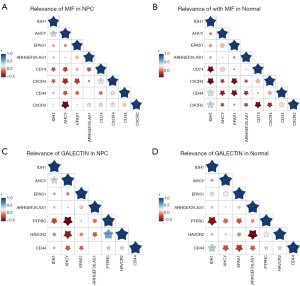 Four genes [CD74, C-X-C Motif Chemokine Receptor (CXCR)4, CD44, and CXCR2] involved in the MIF pathway and three genes [protein tyrosine phosphatase receptor type C (PTPRC), hepatitis a virus cellular receptor 2, and CD44] in the GALECTIN signaling pathway were retrieved from the CellChatDBhuman database. The correlations between the four feature genes and the MIF pathway-related genes (Figure 9A,9B) as well as the GALECTIN pathway-related genes (Figure 9C,9D) were analyzed in both the NPC and normal groups. It was demonstrated that the four feature genes were significantly associated with most of the genes in both signaling pathways. In the normal group, IDH1 exhibited no significant correlations with all MIF and GALECTIN pathway genes, except PTPRC. EPAS1 was significantly correlated with CXCR4. In the NPC group, AHCY was positively correlated with both the MIF pathway and the GALECTIN pathway. Among the four feature genes, AHCY demonstrated a negative correlation with IDH1.