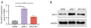 Survival analysis showed that AHCY and EPAS1 were correlated with the survival of NPC patients. In this study, AHCY was selected for subsequent investigation. AHCY expression was examined in NP69, NPC/HK1 and c666-1 cells, and revealed to be significantly elevated in NPC/HK1 and c666-1 cells compared to that in NP69 cells (Figure 10A,10B).