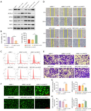 To make investigation into AHCY’s role in NPC cells, AHCY was knocked down in c666-1 cells and overexpressed in NPC/HK1 cells (Figure 11A). Compared to the c666-1 + si-NC group, the c666-1 + si-AHCY group showed significantly reduced cell viability (Figure 11B), increased cell death (Figure 11C), and decreased cell migration and invasion (Figure 11D,11E, Figure S1A). Compared to the NPC/HK1 + oe-NC group, NPC/HK1 + oe-AHCY group showed significantly enhanced cell viability (Figure 11B), reduced cell death (Figure 11C), and promoted cell migration and invasion (Figure 11D,11E, Figure S1B). Moreover, compared to the c666-1 + si-NC group, the c666-1 + si-AHCY group exhibited significantly upregulated expression of ACSL4 and downregulated GPX4 (Figure 11A), along with elevated ROS and MDA levels (Figure 11F,11G) and decreased GSH levels (Figure 11H). Compared to the NPC/HK1 + oe-NC group, the NPC/HK1 + oe-AHCY group showed significantly decreased ACSL4 and increased GPX4 expression (Figure 11A), reduced ROS and MDA levels (Figure 11F,11G), and elevated GSH levels (Figure 11H). Furthermore, altered AHCY expression was found to modulate the Hippo-YAP pathway, leading to changes in the protein levels of both Mst1 and YAP1 (Figure 11A).