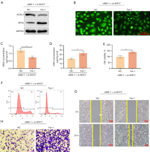 Based on prior bioinformatics analysis and experimental results, we speculated that AHCY regulates the malignant progression of NPC cells through modulation of ferroptosis. To clarify the regulatory mechanism between AHCY and ferroptosis in NPC cells, we treated c666-1 + si-AHCY cells with Fer-1, an inhibitor of ferroptosis. Compared to the c666-1 + si-AHCY group, the c666-1 + si-AHCY + Fer-1 group showed significantly decreased ACSL4 and increased GPX4 expression (Figure 12A), reduced ROS and MDA levels (Figure 12B,12C), elevated GSH levels (Figure 12D), enhanced cell viability (Figure 12E), decreased cell death (Figure 12F), and increased cell migration and invasion (Figure 12G,12H, Figure S1C).