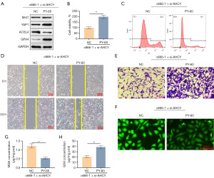 We observed alterations in the expression of Hippo-YAP pathway-related proteins following AHCY knockdown or overexpression. As previously reported, the Hippo-YAP pathway can regulate the occurrence of ferroptosis (9,10). Therefore, we hypothesized that AHCY may regulate ferroptosis by modulating the Hippo-YAP pathway, thereby affecting the malignant progression of NPC cells. To make further investigation into the regulatory mechanism between AHCY and the Hippo-YAP pathway, the Hippo-YAP pathway agonist PY-60 was used to treat cells in the c666-1 + si-AHCY group. It was found that PY-60 treatment significantly increased YAP1 expression without affecting Mst1 level in the c666-1 + si-AHCY + PY-60 group relative to the c666-1 + si-AHCY group (Figure 13A). Correspondingly, cell viability was significantly enhanced (Figure 13B), cell death was significantly decreased (Figure 13C), and cell migration and invasion were markedly promoted (Figure 13D,13E, Figure S1D). Additionally, PY-60 treatment markedly reduced ACSL4 expression and elevated GPX4 expression (Figure 13A). Intracellular ROS and MDA levels were significantly decreased (Figure 13F,13G), while GSH level were significantly increased (Figure 13H).