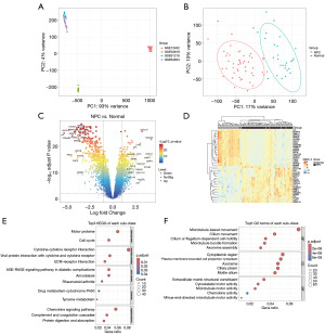 Prior to batch effect correction, samples from different GEO series exhibited considerable dispersion in the principal component analysis (PCA) plot (Figure 1A). Following correction, the Normal and NPC groups were clearly separated in the principal component space (Figure 1B), confirming successful elimination of technical artifacts while retaining biologically meaningful differences between groups. A total of 1,187 DEGs were identified, comprising 696 down-regulated and 491 up-regulated DEGs (Figure 1C). The top 20 up- and down-regulated genes in NPC and normal samples are shown in a heatmap (Figure 1D). Functional enrichment analysis was carried out, with dot plots generated presenting the top entries of GO and KEGG-pathway annotation, respectively (Figure 1E,1F). The significantly enriched pathways included “motor protein”, “chemokine signaling pathway”, and the biological processes mainly involved included “microtubule-based movement”, “motility microtubule bundle formation”, “cilium movement”, “cilium or flagellum-dependent cell”, among others.