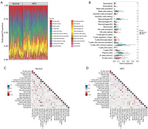 CIBERSORTx was employed for estimating the relative proportions of 22 immune cell types within a heterogeneous cell population. The immune cell composition was visualized using vertically stacked bar plots, while comparative bar charts were generated to illustrate the immune cell distribution differences between the NPC and normal groups. Additionally, the Spearman correlation coefficient was employed for assessing the intercellular relationships between various types of immune cells.