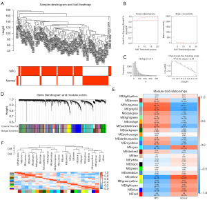 The sample clustering dendrogram exhibits a height of 180, indicating a relatively closer inter-sample distance within the same group (Figure 3A). The optimal soft threshold was determined to be 4 (Figure 3B), achieving a scale-free topology fit index (R2) of 0.86 (Figure 3C). Following this, a co-expression network was constructed, followed by module identification and merging, with the merged modules shown in Figure 3D. Then, the correlation matrix between module feature vectors and disease traits was computed, the correlation coefficient was statistically tested, and a corresponding correlation heatmap was generated (Figure 3E). Modules demonstrating significant correlations with NPC (|correlation coefficient| >0.7) were selected as key modules, ultimately identifying three clinically relevant modules: yellow, grey60, and turquoise. Finally, inter-module similarity was quantified and visualized through a topological overlap matrix-based clustering heatmap (Figure 3F).