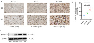Considering that the previous results showed that FAM111B expression was associated with TMB in LGG, oncoplots were used to display the top ten genes with the highest mutation frequency in the FAM111B high and low expression groups, respectively. The results revealed distinct mutation frequencies and patterns between the two groups (Figure 3A,3B). Then we characterized the expression pattern of FAM111B in LGG, and investigated the RNA-seq data from TCGA and CGGA datasets. According to the TCGA dataset, WHO grade III gliomas expressed more FAM111B mRNA than WHO grade II gliomas (Figure 3C). These results were confirmed in the CGGA dataset as well (Figure 3D). Studies have reported that the IDH is closely associated with the occurrence and development of LGG (43), and glioma patients with IDH-mutation generally have a better prognosis than those with IDH-wild-type (44). Therefore, we analyzed the relationship between FAM111B and IDH phenotypes, and found FAM111B was more highly expressed in IDH wild-type glioma in TCGA and CGGA datasets (Figure 3E,3F). Moreover, 1p/19q codeletion is one of the most important genetic changes in LGG (45), and the survival of LGG patients with 1p/19q codeletion is significantly longer than that without codeletion (46). Our results showed that the expression of FAM111B was appreciably upregulated in the 1p/19q non-codel gliomas in comparison to the 1p/19q codeletion gliomas in both TCGA and CGGA datasets (Figure 3G,3H). Besides, we explored the disease-specific survival (DSS) [hazard ratio (HR) =2.68, 95% confidence interval (CI): 1.87–3.82, P˂0.001] and progression-free interval (PFI) (HR =2.09, 95% CI: 1.58–2.77, P˂0.001) of LGG (Figure S2A,S2B), both of which were significantly associated with FAM111B expression. Furthermore, we assessed FAM111B expression across gliomas of different grades via IHC on human glioma specimens, and the results indicated that FAM111B protein levels were higher in high-grade gliomas (Figure 4A,4B). In addition, different glioma cell lines were also tested for expression of FAM111B using Western blotting, and the findings suggested that FAM111B expression was higher in glioma cell lines compared to NHA (Figure 4C).