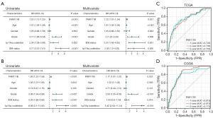Next, univariate and multivariate Cox regression analyses were performed to investigate whether FAM111B expression serves as an independent predictor of prognosis in comparison with other established clinical factors associated with LGG prognosis. In univariate Cox regression analysis of TCGA and CGGA datasets, FAM111B expression level, age, grade, IDH status and 1p/19q codeletion were significantly associated with OS in LGG patients. In multivariate Cox regression, following adjustment for all the above clinical factors, FAM111B expression still had a considerable effect on patient prognosis, suggesting that FAM111B is an independent prognostic factor (Figure 5A,5B). Additionally, receiver operating characteristic (ROC) curve analysis demonstrated that the area under the curve (AUC) was 0.745, 0.736 and 0.743 at 1-, 2-, 3-year stage in TCGA dataset, while AUC was 0.810, 0.813, and 0.773 respectively in CGGA dataset based on FAM111B expression (Figure 5C,5D). As a whole, these finding support the role of FAM111B as a robust independent prognostic biomarker in LGG.