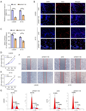 To validate the results of the enrichment analysis, we transfected glioma cell lines with knockdown and overexpression constructs of FAM111B. The efficiency of knockdown or overexpression was confirmed through qRT-PCR (Figure 7A, Figure S4A). Then the cell proliferation, migration and invasion abilities of FAM111B knocked down or overexpression glioma cells were investigated by EdU assay, CCK8 assay and scratch assay in vitro (Figure 7B-7F, Figure S4B-S4F). The results revealed that FAM111B knockdown in LN229 and A172 cells significantly inhibited cell proliferation, invasion, and migration, while overexpression of FAM111B yielded opposite outcomes. Additionally, the regulation of cell cycle by FAM111B was assessed by flow cytometry (Figure 7G, Figure S4G), and the results exhibited that FAM111B knockdown markedly elevated the proportion of cells in G1 and G0/G1 phases in LN229 and A172 cells, while overexpression of FAM111B led to a moderate increase in the proportion of cells in the S phase. These suggest that FAM111B is a key regulator of the cell cycle in glioma cells. Collectively, FAM111B is a key regulator of proliferation, migration, invasion, and cell cycle control in LGG.