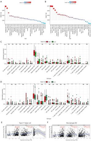 In order to further investigate the role of FAM111B in the immune response of LGG, we obtained 7,732 immune-related genes from the InnateDB website. FAM111B-related genes (|R| >0.4 and P<0.05) from the TCGA dataset were selected for visualization in a heatmap. Of the 407 genes chosen, 403 immune-related genes were considerably positively correlated with FAM111B expression (Figure 8A). Similarly, FAM111B was positively correlated with 322 genes of the 403 selected genes in CGGA dataset (Figure 8B). Furthermore, we used TIMER to investigate the correlation of FAM111B with immune infiltration. It was found that FAM111B expression correlated positively with the levels of B cells, macrophages, CD4+ T cells, CD8+ T cells, neutrophils, and dendritic cells infiltrating the tissues (Figure 8C). Intra-tumoral immune states plays a crucial role in tumorigenesis (47,48). According to Thorsson et al., the immune subtype of LGG was almost classified as C4 (lymphocyte depleted) and C5 (immunologically quiet) (49). Subsequently, we analysed the correlation between the expression of FAM111B and C4, C5 subtypes in LGG. Our results demonstrated that FAM111B expression were higher in C4 subtype (which had the worse prognosis) than in C5 subtype (Figure 8D,8E). Gene signatures of 28 tumor immune cells were downloaded from the TISIDB website for ssGSEA analysis to calculate the correlation between immune cells and FAM111B expression levels, thereby elucidating the specific details of FAM111B and immune infiltration in LGG. We found that FAM111B had the highest correlation with type 2 T helper cells (Th2 cells, a subset of CD4 T cells), in both TCGA and CGGA datasets (Figure 9A,9B). Th2 cells produce pro-inflammatory cytokines to mediate the corresponding inflammatory response to promote tumor progression (50). In addition, we used CIBERSORT to perform a more comprehensive subtype analysis of a subset of immune cells. Interestingly, monocytes and M2 macrophages were significantly different between the high and low-FAM111B group both in TCGA and CGGA databases (Figure 9C,9D). In tumor-associated macrophages (TAMs), M2 macrophages could modulate the immune escape of glioma cells, and thereby promoting tumor growth (51,52). To explore the potential relationship between FAM111B and M2 macrophages and Th2 cells, we further analyzed the correlation of FAM111B expression and biomarkers of M2 macrophages and Th2 cells in LGG (Figure 9E,9F). These results suggested that FAM111B expression was associated with the infiltration of M2 macrophages and Th2 cells in LGG.