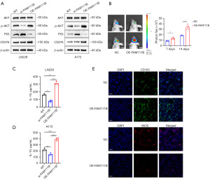 In the orthotopic xenografts, 5×105 luciferase-expressing LN229-FAM111B cells suspended in 5 µL PBS were stereotactically injected into the right frontal lobe of 4-week-old male BALB/c nude mice [coordinates relative to bregma: anterior-posterior (AP) +1.0 mm, medial-lateral (ML) ±0.5 mm, dorsal-ventral (DV) −2.5 mm]. Cells were delivered through a 25 G Hamilton microsyringe at 0.5 µL/min via a burr hole drilled under stereotaxic guidance. Then treat the wound with medical gel and the mice received antibiotic-supplemented saline, tumor progression was monitored weekly by In Vivo Imaging System (IVIS) bioluminescence imaging. Male BALB/c nude mice were obtained from Beijing Vital River Laboratory Animal Technology Co., Ltd. Tumor progression was monitored on days 7 and 14 using bioluminescence imaging with the IVIS Spectrum in vivo system (PerkinElmer, USA). For detailed methods, please refer to Appendix 1. The protocol was prepared before the study with registration in the Institutional Animal Ethics Committee of Qianfoshan Hospital. Experiments were performed under a project license (No. QFSYYSL2023010201; IACUC Issue No. QFSYYPZ2023010401) granted by the Ethics Committee of Shandong Provincial Qianfoshan Hospital, in compliance with the Laboratory Animal—Guideline for Ethical Review of Animal Welfare (GB/T 35892-2018) and institutional guidelines for the care and use of animals.
