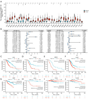 On the basis of data from GTEx and TCGA databases, we examined expression levels of FAM111B across cancer types. The findings clearly indicated that there was a significantly higher expression of FAM111B in 29 forms of cancer compared to their respective normal controls, including kidney cancer, cholangiocarcinoma, colon cancer, glioma, liver cancer, etc. (Figure 1A). A univariate Cox regression analysis was conducted on the TCGA database using median expression of FAM111B to study its effect on OS in the case of pan-cancer, and it was displayed with forest plots (Figure 1B). We observed that high FAM111B expression was associated with improved OS in thyroid carcinoma (THCA) and thymoma (THYM), whereas it predicted poor OS in 10 other tumor types (Figure 1B). Moreover, we performed Kaplan-Meier method to further demonstrate the association between OS and FAM111B expression levels in selected tumors and noted that high FAM111B expression was a favorable factor for OS in THCA and THYM, while patients with high FAM111B expression in LGG, liver HCC (LIHC), LUAD, kidney renal papillary cell carcinoma (KIRP), kidney chromophobe (KICH), PAAD, mesothelioma (MESO) exhibited significantly reduced OS (Figure 1C-1J). Taken together, these findings suggested FAM111B might be a potential prognosis biomarker across multiple cancers.