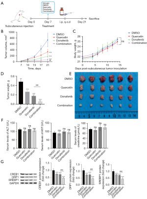 To assess whether our in vitro findings could be replicated in vivo, xenografts were generated from HepG2 cells. Once the tumors became palpable, the mice were randomly assigned to four groups and treated with DON alone, QUE alone, DON and QUE, or DMSO (Figure 4A). At the end of the drug treatment period, both DON and QUE, when administered separately, were found to modestly reduce HCC growth in vivo, while the combined treatment with DON and QUE produced a significantly enhanced inhibitory effect. At baseline (day 1 of treatment), the mean tumor volumes were 133.44±12.47 mm3 (control group), 130.21±5.50 mm3 (QUE group), 133.31±6.07 mm3 (DON group), and 130.29±9.44 mm3 (combination group). After 14 days of treatment, the mean tumor volumes were 375.67±35.27, 274.08±29.37, 222.94±6.56, and 118.20±18.35 mm3, respectively. Notably, there was no significant difference in body weights among all four groups of mice (Figure 4B-4E). Additionally, we measured the levels of AST, ALT, and creatinine in the serum of each nude mouse. The results demonstrated that the combination therapy did not cause any hepatic or renal toxicity in the nude mice (Figure 4F). WB assays showed that the expression levels of CREB1, DRP1, and SREBP1 were markedly higher in the dual-drug group compared to the control and single-drug groups (Figure 4G). In short, these data confirm that QUE enhances the sensitivity of HCC cells to DON treatment in vivo.