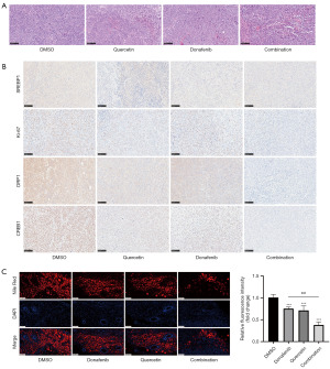 To understand the effects of DON and QUE, alone or in combination, on the architecture of the tumors, HE staining, IHC staining, and Nile Red staining were sequentially performed on tumor sections, and the results were observed under a microscope. HE staining confirmed the presence of tumor tissue in the section (Figure 5A). IHC staining showed that DON and QUE significantly reduced the expression of Ki-67, CREB1, DRP1, and SREBP1 in the tumor tissues (Figure 5B). Nile Red staining further confirmed that DON and QUE significantly reduced neutral fat content in the tumor tissues (Figure 5C). Quantitative analysis of fluorescence intensity revealed a significant decrease in lipid droplet accumulation in the combination group compared to the control and single-drug groups.