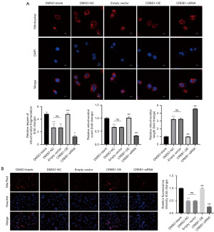DRP1 is known to be an important protein in the regulation of mitochondrial fission activity, and it has been demonstrated that inhibition of mitochondrial fission activity further decreases lipid metabolism in HCC cells. The effect of drug treatment on the mitochondrial morphology of HepG2 cells was subsequently observed using confocal microscopy, showing that the combination treatment of QUE and DON significantly inhibited mitochondrial fission, but overexpression of CREB1 reversed this effect. Conversely, this inhibitory effect was enhanced following CREB1 knockdown (Figure 7A). Additionally, the Nile red staining assay revealed a significant reduction in intracellular lipid droplet content in HepG2 cells following combination treatment, with partial recovery observed after CREB1 overexpression. On the contrary, when HepG2 cells were treated with dual drugs and CREB1 expression level was knocked down, we observed a further decrease in intracellular lipid droplet content (Figure 7B).