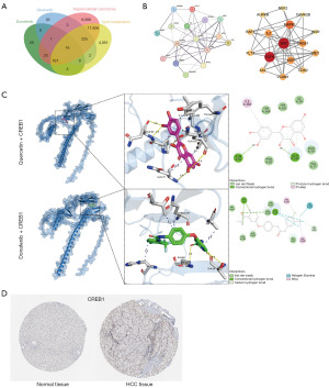 The chemical structure files for QUE and DON were obtained from the PubChem database (https://pubchem.ncbi.nlm.nih.gov/) and downloaded in SDF format. The structure files were imported into the SwissTargetPrediction database (http://www.swisstargetprediction.ch/) and the Similarity Ensemble Approach (SEA) database (https://sea.bkslab.org/) to predict the potential targets. The keywords “hepatocellular carcinoma” (HCC) and “lipid metabolism” were used in searching for targets on the GeneCards website (https://www.genecards.org/). Subsequently, overlapping targets were screened using Venn diagrams, and network diagrams of common targets were generated using Cytoscape software (v3.10.2). Protein-protein interactions of the common targets were gathered from the String database platform (https://cn.string-db.org/) and visualized using the Cytoscape plug-in STRING. IHC staining images of CREB1 in liver cancer tissue and normal liver tissue were downloaded from the Human Protein Atlas (HPA) database (https://www.proteinatlas.org). The transcriptome and corresponding clinical data of liver cancer patients [The Cancer Genome Atlas-liver hepatocellular carcinoma (TCGA-LIHC)] are available for download from the TCGA database. The study was conducted in accordance with the Declaration of Helsinki and its subsequent amendments. This dataset includes 374 samples of HCC tissue and 50 samples of adjacent liver tissue, with the data type being “read counts”. Potential target genes of CREB1 were identified in TCGA-LIHC, and unrecognized entries were removed. Differential analysis was performed using the “Deseq2” package in R software (R version 4.3.2), with the criteria for screening differential genes as follows: |log2 fold change (FC)| >0.4, Padj <0.05. Volcano maps were generated using the “ggplot2” package, while heat maps were generated using the “pheatmap” package.