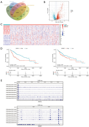We further obtained the downstream action targets of CREB1, HCC, and lipid metabolism-related genes from the databases and generated a Venn diagram, identifying 6,594 genes (Figure 2A). The volcano plot and the heat map using these genes revealed that both DNM1L, which is associated with mitochondrial fission, and SREBF1, which is associated with lipid metabolism, were differentially expressed in HCC (Figure 2B,2C). High expression of DNM1L was found to be associated with lower OS in HCC patients, as shown by the Kaplan-Meier (K-M) curves (Figure 2D). We further found the peaks of CREB1 at the promoters of both DNM1L and SREBF1 by performing Integrative Genomics Viewer (IGV) visualization, suggesting that CREB1 may regulate transcription of DNM1L and SREBF1 (Figure 2E).