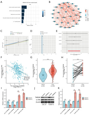 TCGA data analysis showed a strong negative correlation between the expression levels of TMEM9 and IL1RN (Spearman R=−0.375, P<0.001; Figure 4F). Both genes were consistently downregulated in OSCC compared to normal tissues across multiple datasets (TCGA, GSE30784, GSE146483; Figure 4G,4H). Experimental validation further demonstrated that knockdown of TMEM9 significantly increased IL1RN expression at both transcriptional and translational levels in TCA8113 and CAL-27 cell lines (P<0.01; Figure 4I,4J). Overall, these findings suggest that the silencing of TMEM9 may inhibit OSCC progression through IL1RN-mediated tumor-suppressive pathways.
