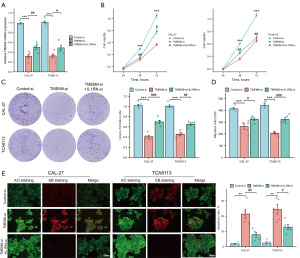 The assessment of cell proliferation kinetics was conducted using MTT colorimetric assays (3-(4,5-dimethylthiazol-2-yl)-2,5-diphenyltetrazolium bromide, Servicebio, Wuhan, China, Cat# GC307004-5g). In 96-well flat-bottom plates (Corning, New York, USA, Cat# 3599), cells were seeded at a concentration of 2×103 cells per well in 100 µL of complete medium. After a 24-h incubation period, 10 µL MTT reagent (5 mg/mL in PBS; Servicebio, Wuhan, China, Cat# G0201-1) was added to each well daily for 5 consecutive days, followed by 4-hour incubation at 37 ℃ to facilitate formazan formation. Formazan crystals were dissolved in 100 µL of DMSO (Sigma, Wayne County, MO, USA, Cat# D8418) while being shaken orbitally at 200 rpm for 15 minutes. The measurement of absorbance at 570 nm was performed using a Multiskan™ FC microplate reader from Thermo Scientific, Waltham, USA.