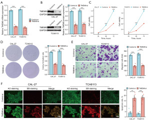 To investigate TMEM9’s functional role in OSCC, stable knockdown was achieved in TCA8113, and CAL-27 cell lines using siRNA targeting TMEM9. Knockdown efficiency was confirmed at both transcriptional and protein levels by qRT-PCR and western blotting (Figure 3A,3B). MTT assays revealed that TMEM9 silencing significantly attenuated cellular proliferation in both cell lines (P<0.01; Figure 3C). Consistent with proliferation data, TMEM9-depleted cells exhibited significantly reduced colony-forming capacity compared to scramble siRNA controls (P<0.001, Figure 3D). Transwell migration assays further indicated that TMEM9 deficiency substantially impaired cell motility (Figure 3E). AO/EB staining demonstrated significantly enhanced apoptosis in TMEM9-knockdown cells versus controls (Figure 3F). Collectively, these functional analyses establish that knockdown TMEM9 suppresses OSCC cell proliferation, migration, and survival.