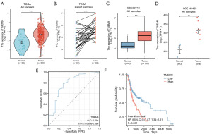 We initially analyzed the mRNA expression of TMEM9 in OSCC with data from the TCGA database. The analysis revealed a significant elevation of TMEM9 expression in OSCC cancer tissues relative to normal tissues (Figure 1A). Moreover, the expression of TMEM9 was significantly elevated in OSCC tissues compared to the surrounding normal tissues (Figure 1B). These results were corroborated by analyses of Gene Expression Omnibus (GEO) database (GSE30784 and GSE146483, Figure 1C,1D). The ROC analysis showed that TMEM9 has diagnostic potential, with an AUC of 0.793 and a 95% confidence interval ranging from 0.699 to 0.886, highlighting its ability to distinguish OSCC (Figure 1E). Patients with elevated TMEM9 expression exhibited significantly reduced 5-year overall survival compared to those with lower expression levels (log-rank P<0.001; Figure 1F), collectively suggesting that TMEM9 may function as a putative oncogene in OSCC pathogenesis.