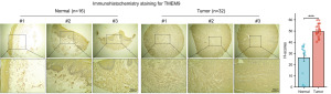 Immunohistochemical analysis confirmed stronger TMEM9 protein staining intensity in OSCC specimens (n=32) compared to normal mucosal controls (n=16; Figure 2). Analysis of the TCGA cohort analysis (n=330) revealed significant associations between TMEM9 expression and key clinicopathological parameters (Table 1), with elevated TMEM9 levels showing a strong correlation with advanced T stage (P<0.001). Multivariate logistic regression confirmed TMEM9’s independent prognostic value after adjusting for confounders.