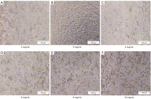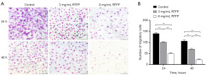 Increasing concentrations of RTFP led to a progressive reduction in the number of cells migrating through the Transwell membrane (Figure 4). Quantitative results showed that after 24 h, invasive cell numbers were 140±6 (control), 101±2 (3 mg/mL, P<0.05), and 49±5 (6 mg/mL, P<0.01). After 48 h of treatment, the number of invading cells was 106±5 in the control group, 69±4 in the 3 mg/mL RTFP group (P<0.05), and 21±4 in the 6 mg/mL RTFP group (P<0.01). This corresponded to approximate reductions of 35% and 80%, respectively, relative to the control. These findings suggest that RTFP inhibits HeLa cell invasion in a time- and dose-dependent manner.