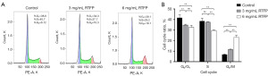 HeLa cells (1×106 cells) were seeded into six-well plates (NEST) and cultured for 12 h. The medium was then replaced with FBS-free MEM medium, and the cells were incubated for an additional 12 h. Subsequently, the Control group was supplemented with 2.5 mL of complete MEM medium, while the RTFP group was treated with 2.5 mL of complete MEM medium containing RTFP at 3 and 6 mg/mL, with three replicates per group. After 48 h, the cells were harvested via trypsinization (Vazyme, Nanjing, China), centrifuged at 900 rpm for 4 min, and fixed in 75% pre-chilled ethanol for 24 h. Prior to analysis, the cells were centrifuged again at 900 rpm for 4 min, stained with 500 µL of propidium iodide (PI) (Beyotime, Shanghai, China) staining solution, and incubated at 37 ℃ in the dark for 30 min. Cell cycle distribution was subsequently analyzed using a BD FACSCanto™ II flow cytometer (BD Biosciences, San Jose, CA, USA). At least 20,000 events were collected for analysis for each sample.