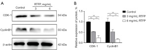 Compared with the Control group, RTFP significantly downregulated the expression of CDK-1 and cyclin B1 proteins (P<0.01) (Figure 6). These findings suggest that RTFP may arrest the HeLa cell cycle at the G2/M phase by downregulating CDK-1 and cyclin B1 protein expression.