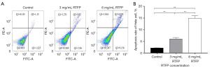 Apoptosis was assessed by flow cytometry after 48 h of RTFP treatment (Figure 7). The total apoptosis rates were 2.96%±0.15% (control), 6.78%±0.38% (3 mg/mL RTFP), and 17.68%±0.68% (6 mg/mL RTFP), with the treated groups showing significant increases compared to the control (P<0.01). Detailed quadrant analysis revealed early apoptosis rates of 1.13%, 2.96%, and 9.16%, and late apoptosis rates of 1.83%, 3.82%, and 8.52% for the control, 3 mg/mL, and 6 mg/mL groups, respectively. These findings indicate that RTFP induces HeLa cell apoptosis in a dose-dependent manner.