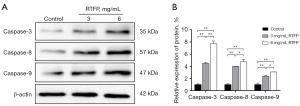 Compared with the control group, RTFP significantly upregulated the expression of pro-apoptotic proteins Bax, caspase-3, caspase-8, and caspase-9 (P <0.05) and downregulated the expression of anti-apoptotic protein Bcl-2 (P<0.01) in a dose-dependent manner (Figures 8,9).