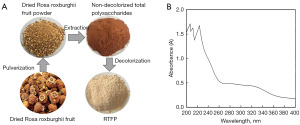 The fruits of Rosa roxburghii Tratt were purchased from a traditional Chinese medicine wholesale market in Dali Bai Autonomous Prefecture, Yunnan Province, China, and were authenticated botanically by Prof. Chen (Dali University). The extraction procedure was adapted from a previously reported method (21). Briefly, the dried fruits were ground into particles of 10–20 mesh, defatted with petroleum ether (3× volume, refluxed twice for 3 h each), and the residue was filtered and dried at 55 ℃ to constant weight. Polysaccharides were extracted by hot-water stirring (material-to-liquid ratio 1:30 g/mL) at 70 ℃ for 3 h, and the extraction was repeated three times. The combined extracts were concentrated under reduced pressure, followed by deproteinization using the Sevage method (chloroform: n-butanol =4:1) twice (Fuchen Chemical Reagent Factory, Tianjin, China). Polysaccharides were precipitated by adding four volumes of ethanol and standing overnight at 4 ℃. The precipitate was collected, washed sequentially with anhydrous ethanol, acetone, and diethyl ether, and then decolorized with macroporous resin (Macklin Biochemical Co., Ltd., Shanghai, China). After freeze-drying, the refined polysaccharide fraction (RTFP) was obtained (Figure 1A). The polysaccharide yield was determined using the anthrone-sulfuric acid method (22). To evaluate purity, RTFP was dissolved in water (1 mg/mL) and scanned by ultraviolet-visible (UV-Vis) (Jinghua Scientific Instrument Co., Ltd., Shanghai, China) spectrophotometry (260–280 nm) to detect potential protein or nucleic acid contamination.