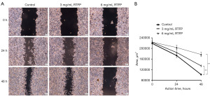 RTFP inhibited HeLa cell migration in a dose- and time-dependent manner (Figure 3). At 24 h, the residual wound areas significantly increased to 184,915.05±11,684.59 µm2 (3 mg/mL, P<0.05) and 203,433.11±8,236.04 µm2 (6 mg/mL, P<0.01), compared with 173,362.38±7,580.23 µm2 in the control group. The inhibitory effect was more pronounced at 48 h, with migration inhibition rates of approximately 35% (3 mg/mL) and 74% (6 mg/mL), respectively, relative to the control. Correspondingly, the residual wound areas were 137,543.83±4,721.27 µm2 (3 mg/mL, P<0.05) and 177,361.02±8,136.19 µm2 (6 mg/mL, P<0.01), vs. 102,013.92±1,073.68 µm2 in the control group.
