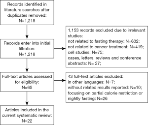 In the initial searches, a total of 1,218 articles were identified after duplicated removed. Then, 1,153 articles were excluded due to irrelevant contents, including 632 studies not related to fasting therapy, 419 studies not related to cancer treatment, 75 studies on cells, and 27 cases, letters and conference abstracts. Among the remaining 65 studies, 43 were excluded after secondary full-text screening, including 7 studies in other languages, 10 studies without related results reported, and 26 studies focusing on partial CR or nightly fasting. Eventually, a total of 22 articles published from 2002 to 2016 were considered as eligible and included in the current systematic review (9-30) (Figure 1).