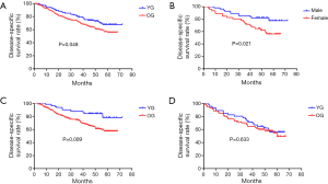 As of September 1, 2015, the 5-year disease-specific survival rate for all 302 patients was 51.3%. The median observation periods were 46.4 months in the YG (range, 4–72 months) versus 43.1 months in the OG (range, 1–68 months). Thirty of our younger patients died during the study period. The 5-year disease-specific survival rate was 67.7% in the YG and 55.8% in the OG. The survival curves of the two groups are shown in Figure 2A. The 5-year disease-specific survival rate of the YG was better than that of the OG (P=0.048, Figure 2A). In the YG, a significantly lower survival rate was observed for female patients with GC compared to males with GC, as presented in Figure 2B (56.1% and 77.6%, respectively; P=0.021). Male patients with GC in the YG showed a significantly higher 5-year disease-specific survival rate compared to those in the OG (77.6% and 57.6%, respectively; P=0.009; Figure 2C), while females did not present this difference with age (56.1% and 49.4%, respectively; P=0.633; Figure 2D).