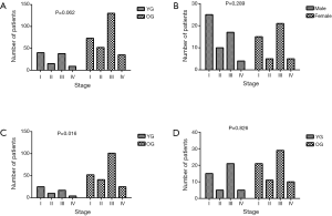 The TNM stage distribution was compared between the YG and OG, males and females in the YG, males in the YG and OG, and females in the YG and OG (Figure 3). More patients were in the I-stage and fewer patients were in the III-stage in the YG than the OG, but this finding was not significant (39.2% and 37.3% vs. 25.2% and 44.8%, respectively; Figure 3A, P=0.062). In the YG, males showed a higher proportion of I-stage disease than females, but this finding also was not significant (44.6% vs. 32.6%, respectively; Figure 3B, P=0.289). In addition, no significant difference was found between the TNM stage distribution of the YG and OG in females (Figure 3D, P=0.826). Figure 3C shows that there was a significant difference between the YG and OG among males; in particular, males in the YG showed a higher percentage of I-stage and a lower percentage of III-stage compared to males in the OG (44.6% and 30.4% vs. 23.7% and 46.1%, respectively; P=0.016).