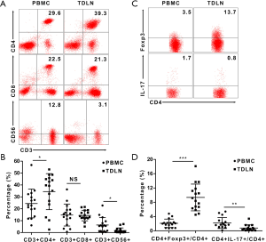 Subsequently, we compared the proportions of different CD4+ T cell subsets, including CD4+Foxp3+ T (Treg) cells and IL-17-producing CD4+ T (Th17) cells. The proportion of Treg/CD4+ cells was higher in the TDLN than in the PBMC [9.4%±3.7% vs. 2.1%±1.2% (P<0.001)] (Figure 1C), while the Th17/CD4+ cells was lower in the TDLN than in the PBMC [0.8%±0.9% vs. 2.2%±1.5% (P=0.001)] (Figure 1C,D) (Table 1). Moreover, we found that the proportion of Treg/CD4+ cells was lower in T1 stage than T2 stage tumors [7.3%±1.9% vs. 11.0%±4.1%, respectively (P=0.045)] (Table 2).