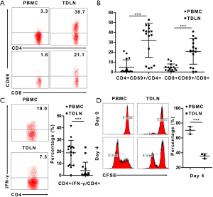 As the TDLN was the first location in which the specific recognition of tumor antigens and appropriate activation of lymphocytes occur, we want to know whether the T cells presented early activation. As CD69 was considered as a marker of early activation of T cells (16), we detected the expression of CD69 by using flow cytometry and found that both CD4+ and CD8+ T cells subgroup were more activated in the TDLN than the PBMC. The proportion of CD4+CD69+/CD4+ cells in the TDLN was 32.0%±17.2% vs. 5.0%±7.3% in the PBMC (P<0.001); and CD8+CD69+/CD8+ cells in the TDLN was 20.8%±12.9% vs. 4.5%±3.6% in the PBMC (P<0.001) (Figure 2A,B). In another hand, considering that the immune status of TDLN was suppressed described above; we explored capacity of T cells. First, we explored the proportions of IFN-γ-producing CD4+ T (Th1) cells, which lead to cell mediated anti-tumor immunity. We found that the proportions of Th1/CD4+ cells were lower in the TDLN than in the PBMC [4.0%±7.1% vs. 19.0%±10.5% (P<0.001)] (Figure 2C). Next, we measured the level of CFSE dilution exhibited by CFSE-labeled cells from the TDLN and PBMC, to explore the proliferative capability of the T cells. The mean proliferation rate of T cells in the TDLN was lower (35.6%±3.2%) compared to the PBMC (70.3%±5.0%) (P=0.001) (Figure 2D). Together, these data suggest that the T cells were activated, while the capacity was suppressed.