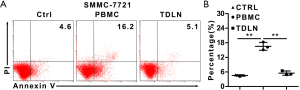 Last, we want to explore the cytotoxicity of the immune cells derived from the TDLN in vitro. We performed co-culture experiments in which the cells expended from TDLN or PBMC were cultured with SMMC-7721 cells for 1 day. The apoptosis ratio of the SMMC-7721 cells was higher in the PBMC group compared to the TDLN group (16.5%±1.6% and 5.5%±0.9%) (P=0.002) (Figure 4A,B). Together, these data suggest that the anti-tumor capacity of immune cells in TDLN was suppressed.
